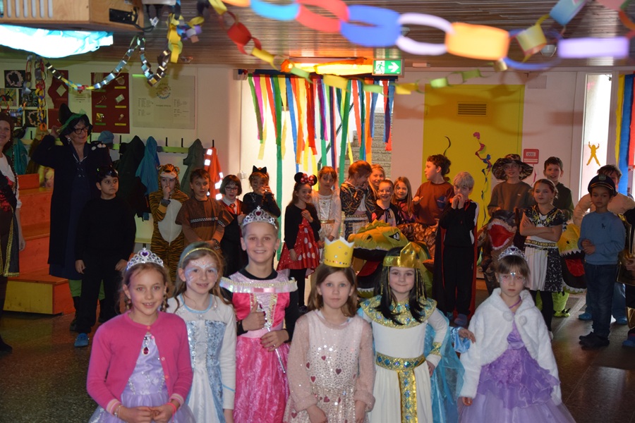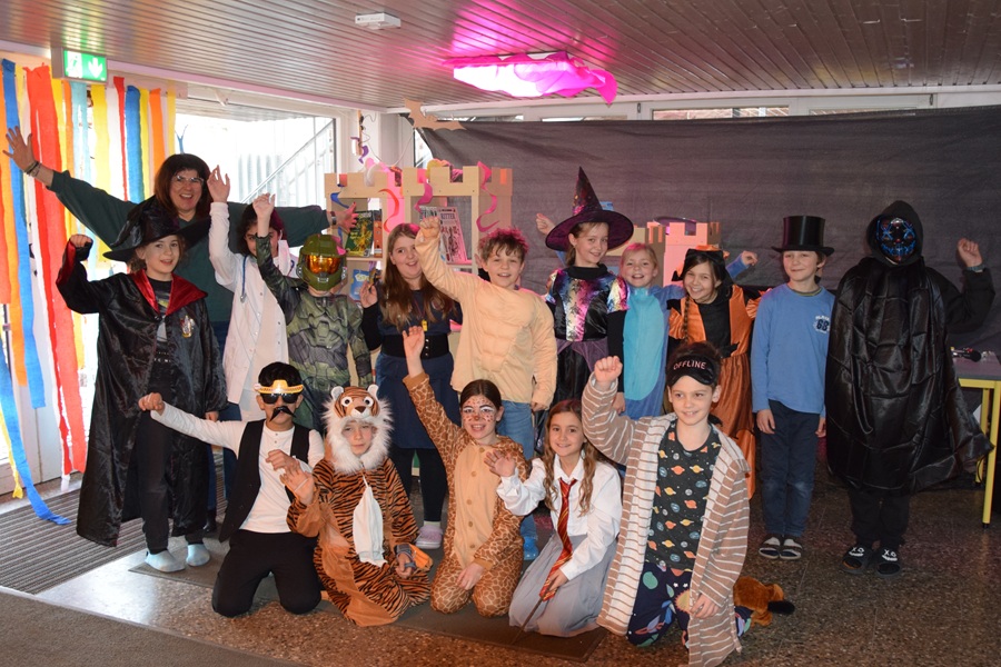 Zuerst gab es eine ganz besondere erste Unterrichtsstunde, die nicht wie üblich von Lehrerinnen und Lehrern, sondern von Piraten, Rockern, Faschingsmäusen, Hippies, Cowgirls, Schneiderinnen und anderen Narren gehalten wurden. Anschließend standen Knobelaufgaben und verschiedenen Spiele auf dem Programm. Nach einer Stärkung am Faschingsbuffet kam die Pause im Schulhof gerade recht.