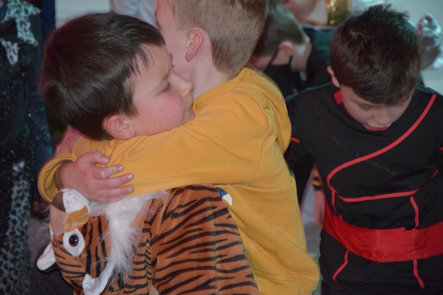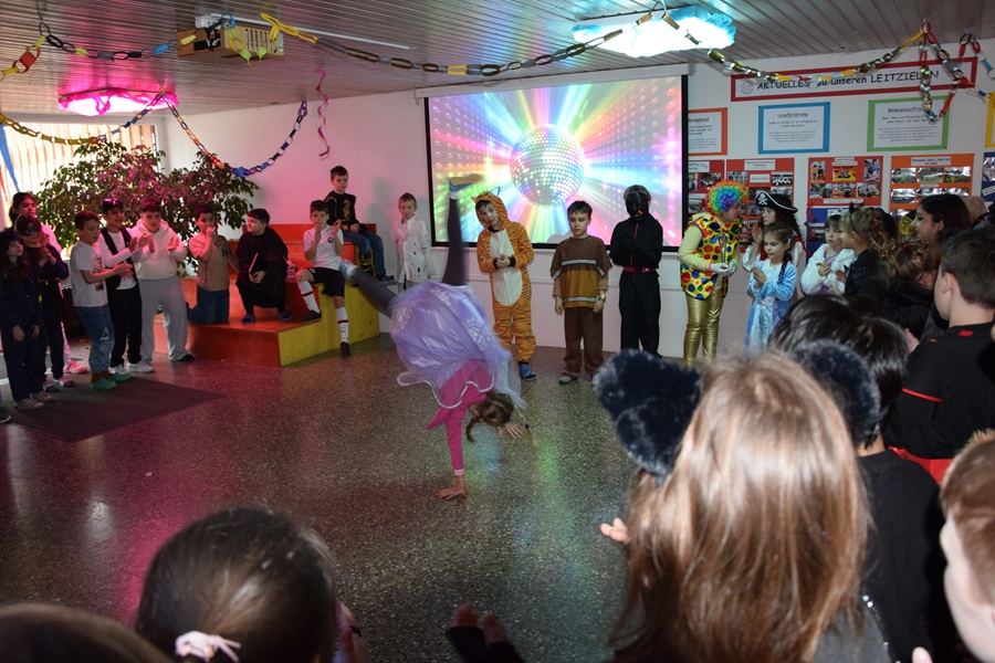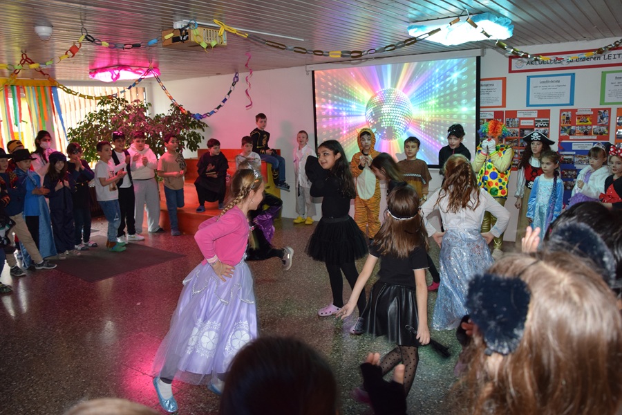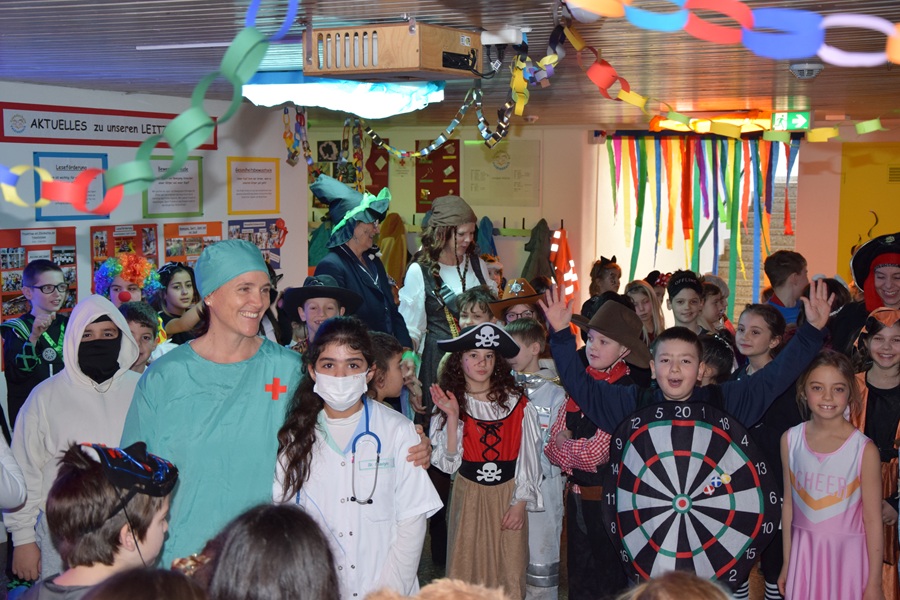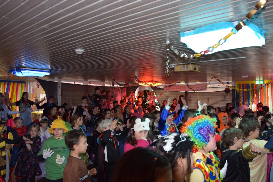 Plötzlich - als alle Kinder wieder im Unterricht waren, zog aus dem Nichts eine bunte Karawane durchs Schulhaus. Alle Närrinnen und Narren schlossen sich der ausgelassenen Polonäise hinter einem besonders schrecklichen Piraten an und zogen gemeinsam in den bunten Saal ein. Was bisher eigentlich die Pausenhalle der Grundschule war, hatten Kinder und Lehrerinnen in einen bunten Faschingspalast verwandelt. Bei einer großen Kostümschau wurden alle Kostüme mit Applaus gefeiert. Gemeinsame wurde so wild getanzt und gespielt, dass allen Jecken unter ihren Verkleidungen mächtig ins Schwitzen kamen. Besonders die Vorführungen verschiedener Klassen und das gemeinsame Spiel Just Dance fanden alle spitze.