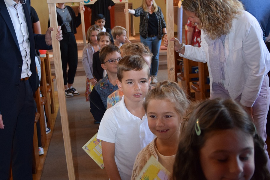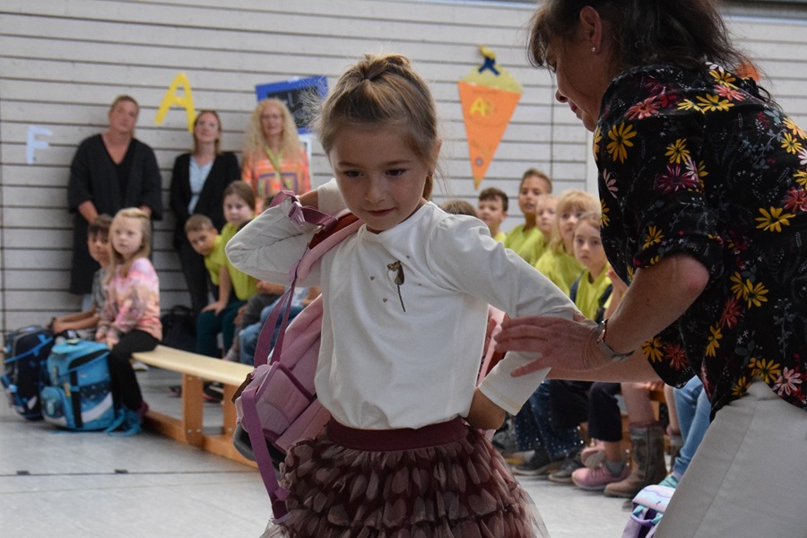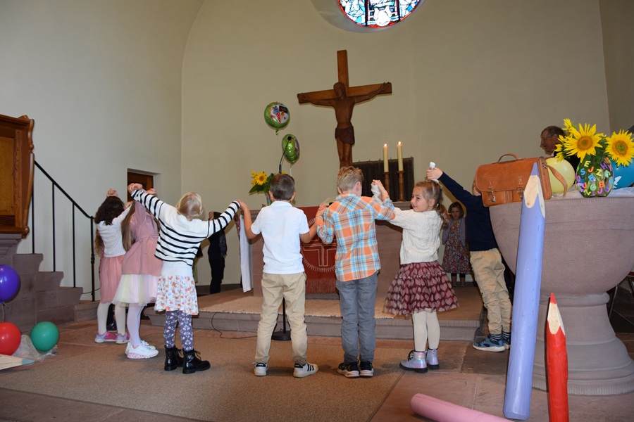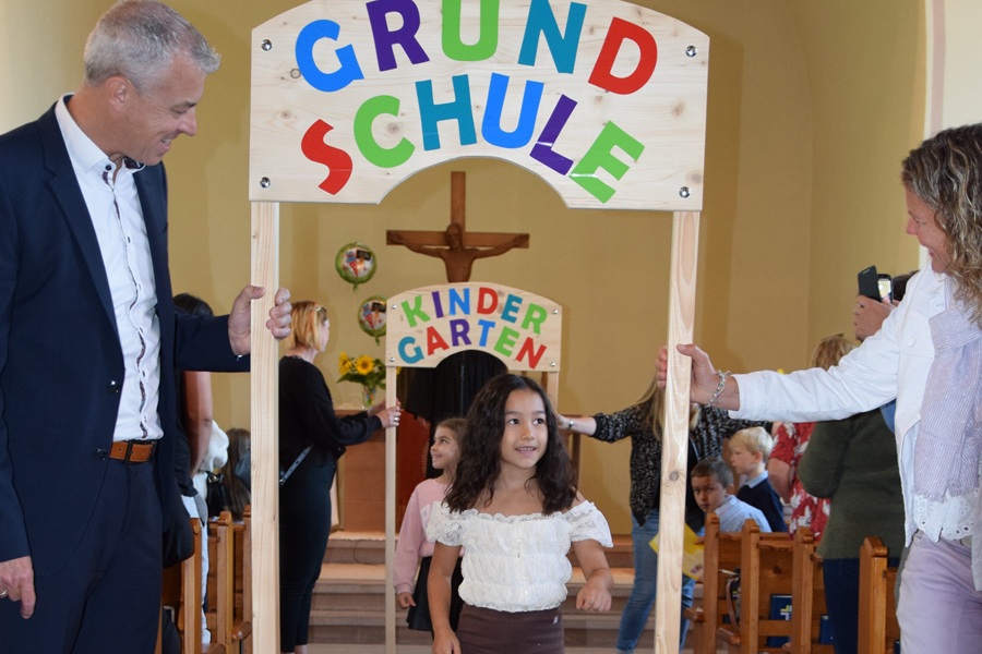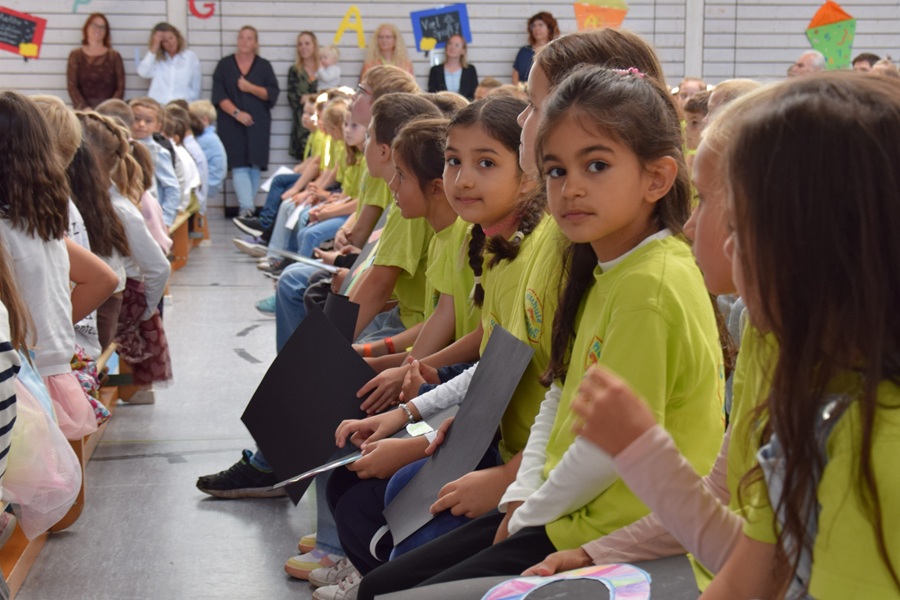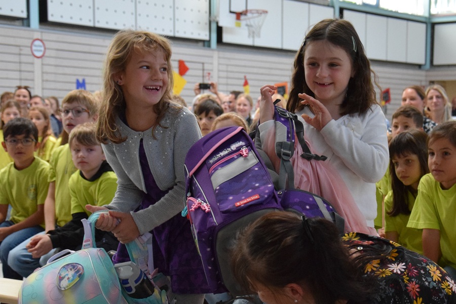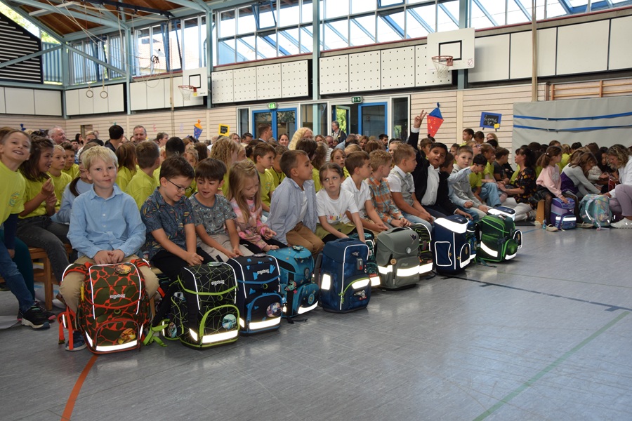 Im Anschluss an den Gottesdienst warteten die großen Schulkinder auf ihre neuen Mitschüler in der festlich geschmückten Turnhalle mit einem bunten Einschulungsprogramm und dem passenden Lied zum Start: „Einfach spitze, dass ihr da seid“.