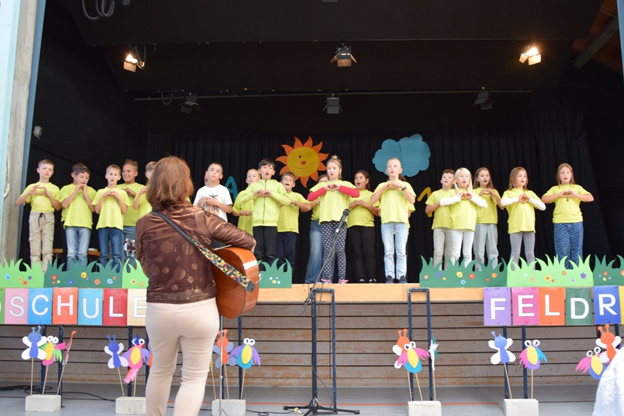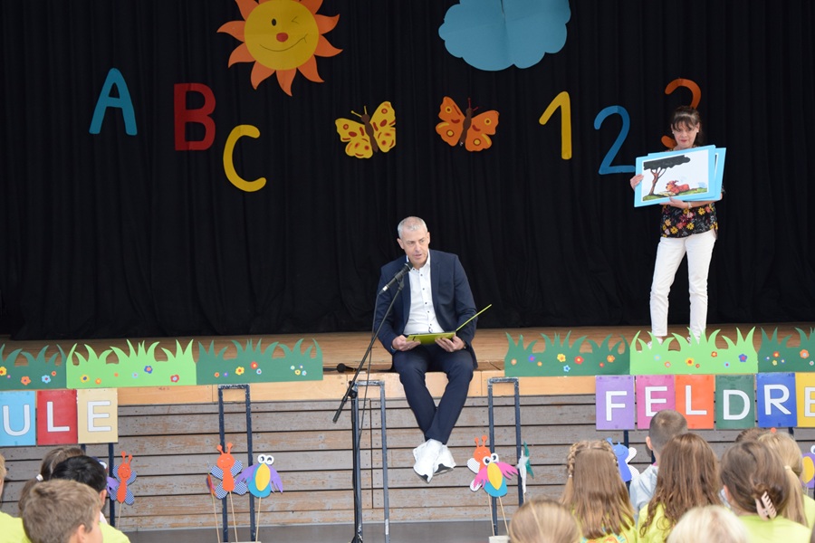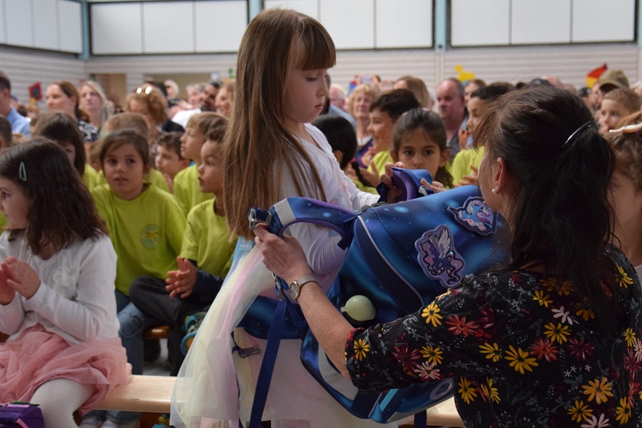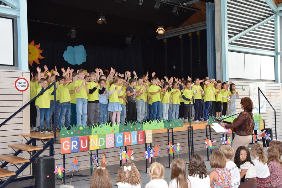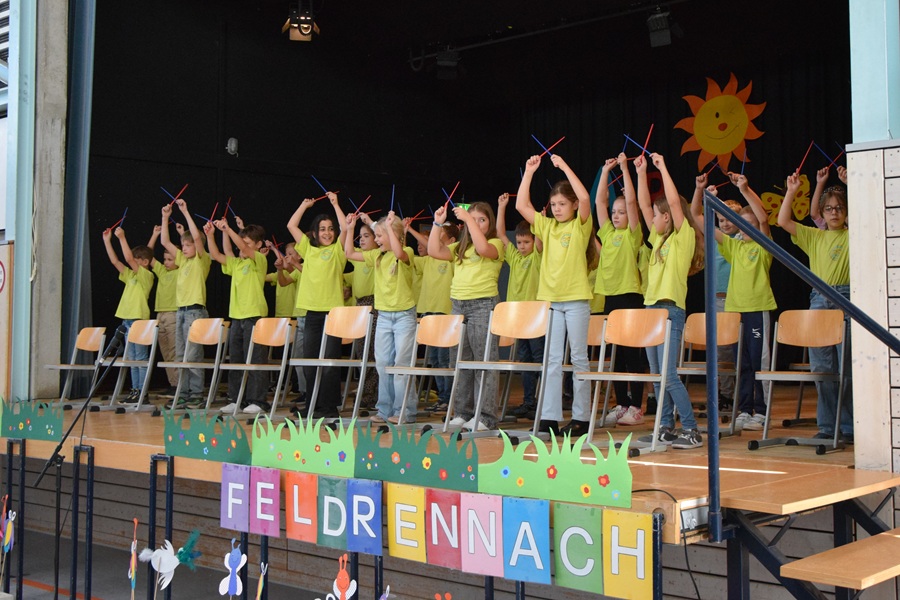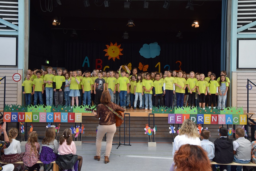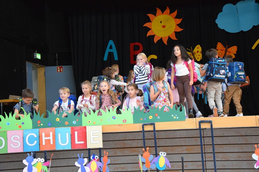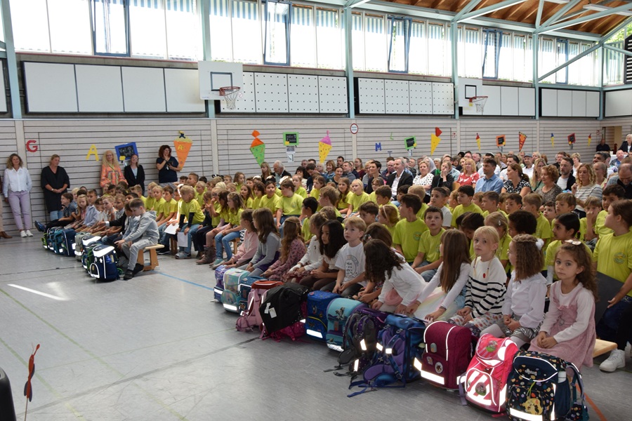 Schulleiter Mathias Greb begrüßte die Neuen, welche ganz vorne in der ersten Reihen Platz genommen hatten, mit einer kleinen Geschichte vom "Löwen, der nicht schreiben konnte“. Die Klassen 2a und 2b sangen gemeinsam das Lied "Die Partner von Zehn" für ihre neuen Mitschüler. Mit dem Lied „Seid willkommen“ begrüßte die dritte Klasse die Schulanfänger. Einen "Tanz mit Stühlen" hatten die beiden Klassen 4a und 4b gemeinsam einstudiert, um die ABC-Schützen in der Schulgemeinschaft zu begrüßen.