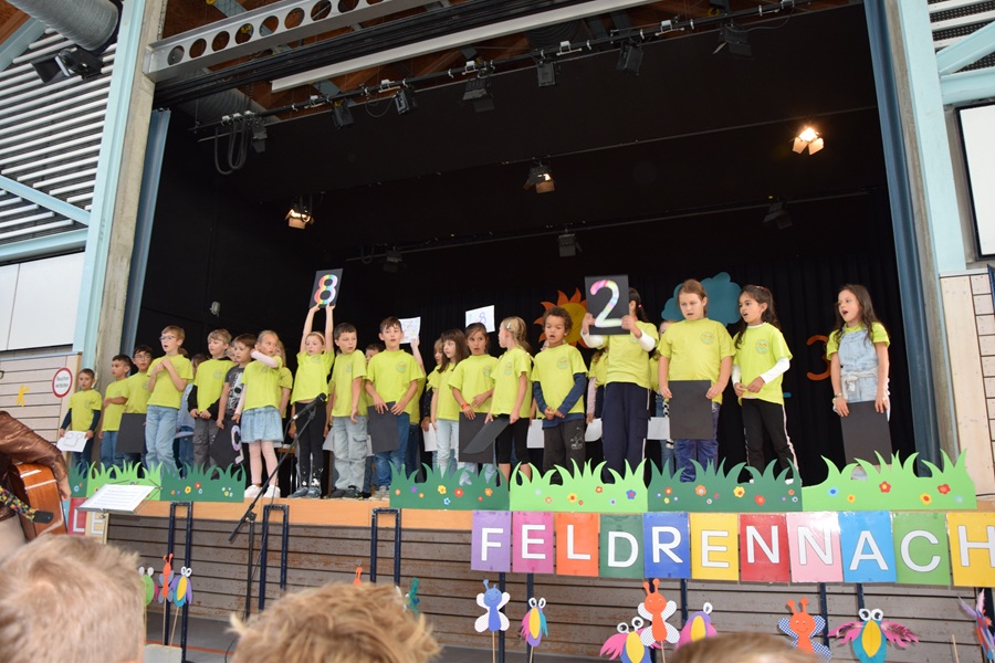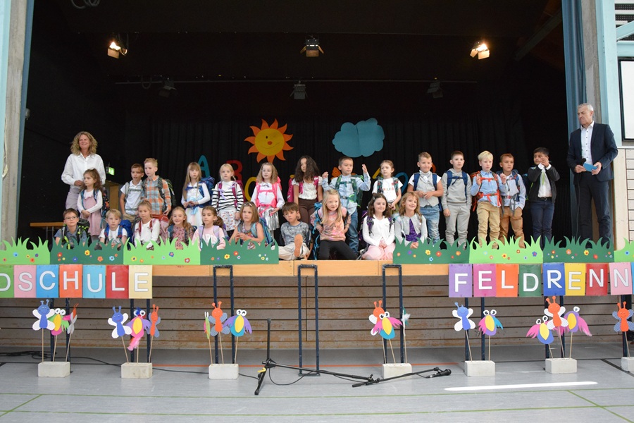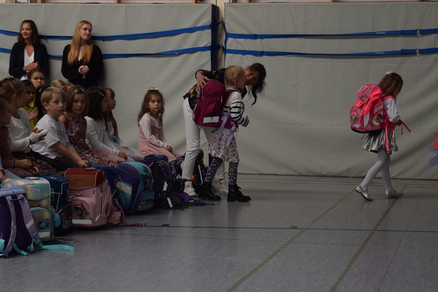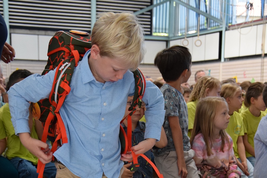 Klassenlehrerin Frau Micol rief dann alle 24 stolzen Erstklässlerinnen und Erstklässler zu sich auf die Bühne, wo jedes Kind seinen Platz in der Klasse 1 fand. Herr Greb wünschte den Eltern ein offenes Ohr für ihre nun großen Kinder, den Lehrerinnen gutes Gelingen für die gemeinsame Arbeit und den neuen Schulkindern eine spannende und erfolgreiche Schulzeit. Durch das Spalier der anderen Schulkinder gingen die "Neuen" dann ihren Weg ins Schulhaus für ihre allererste Schulstunde.