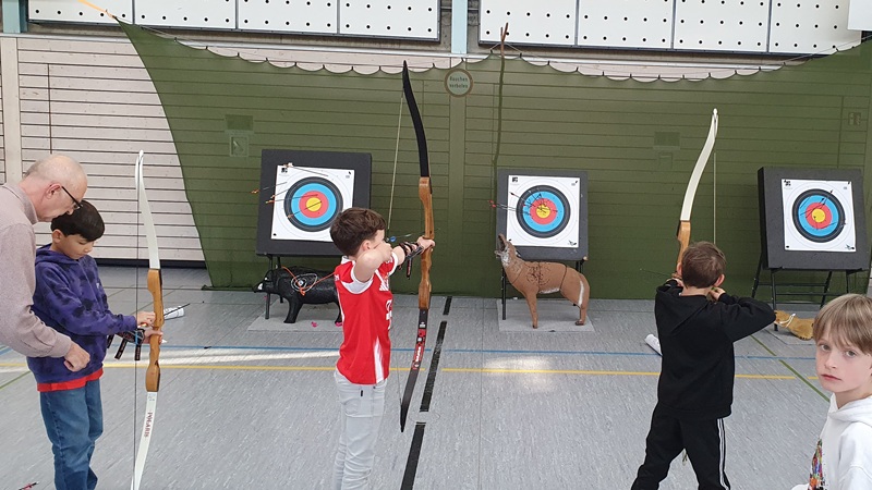 Die Kinder der Bogen-AG hatten sehr viel Spaß und auch tolle Erfolge während dem gemeinsamen Training mit Rigo Ochs. Wie die Kinder schnell gelernt haben ist Bogenschießen die Kunst der exakten Wiederholung eines einstudierten Bewegungsablaufes. In verschiedenen Variationen trainierten die Kinder zusammen mit dem Trainerteam Rigo, Yannik und Gerhardt. Gegen Ende der AG trafen alle Kinder dank der einstudierten Technik im wahrsten Sinne ins Schwarze.