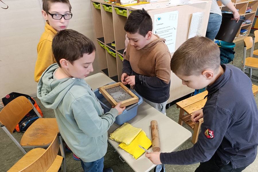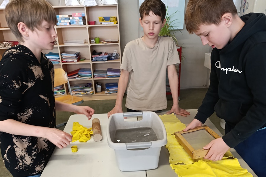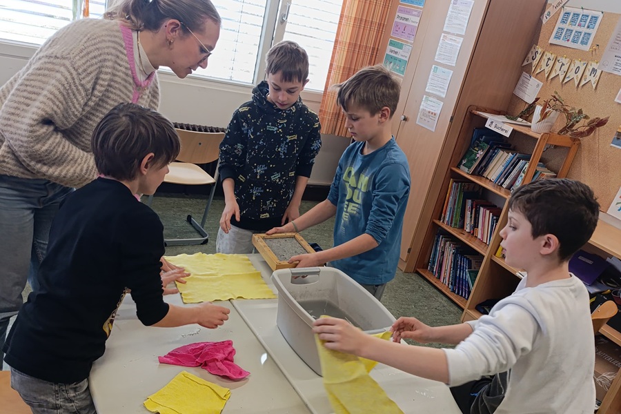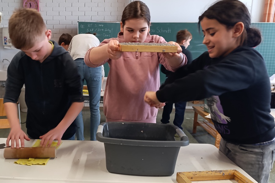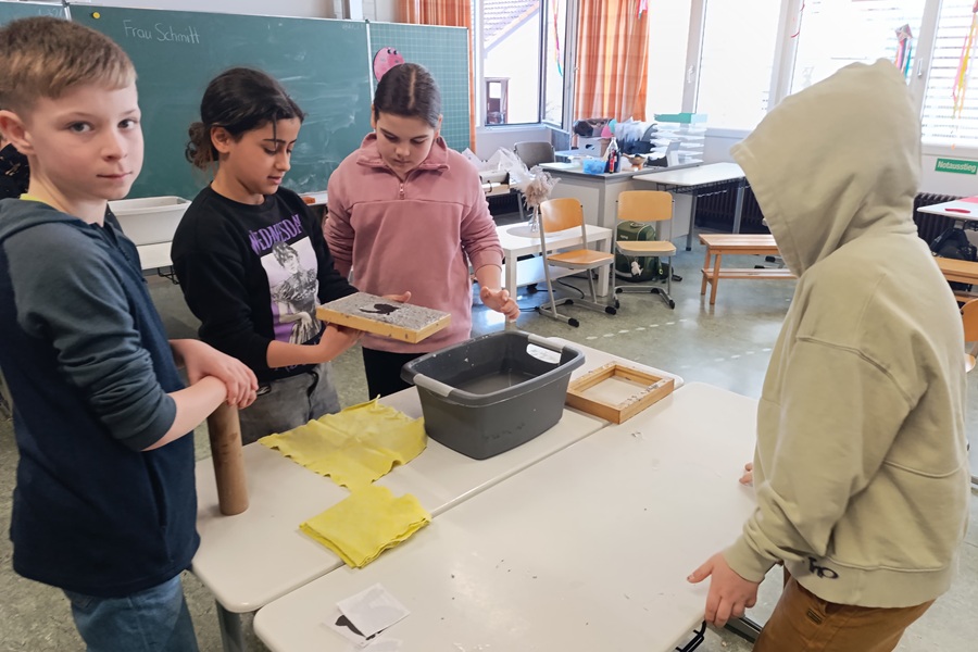Frau Schmitt erklärte uns, welcher Müll in welche Tonne kommt und hatte hierfür einiges dabei, das wir sortieren durften. Im Anschluss durften wir altes Papier recyceln. Hierfür gaben wir Papierreste in einen Behälter mit Wasser und schöpften es mit einem Sieb heraus. Einen kleinen Papierosterhasen legten wir auf die Papierreste und ließen alles trocknen. Dabei entstanden originelle Osterkarten.