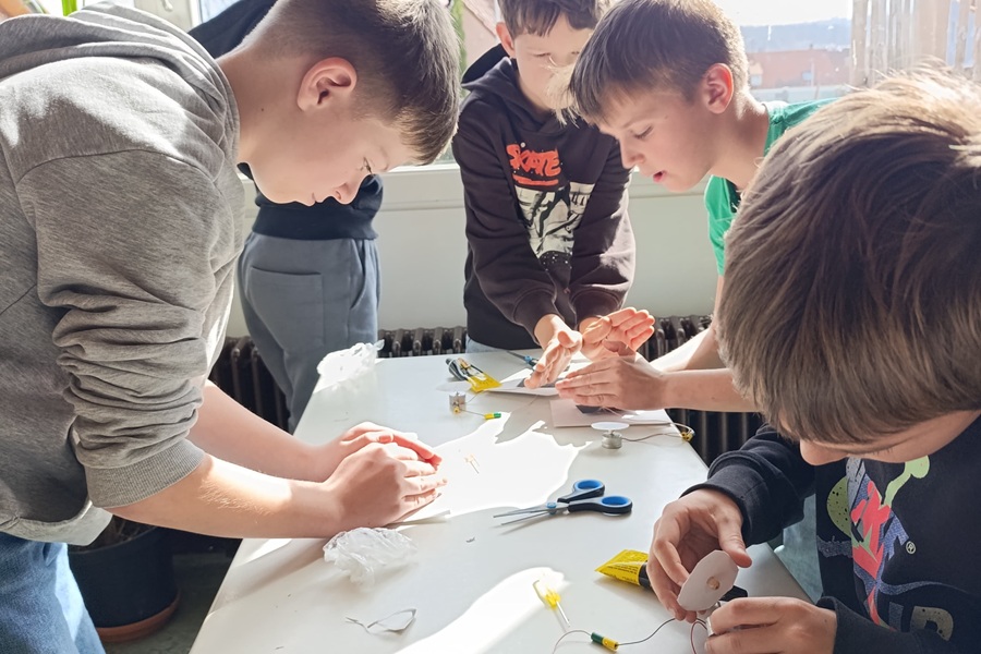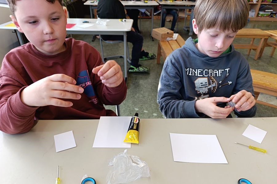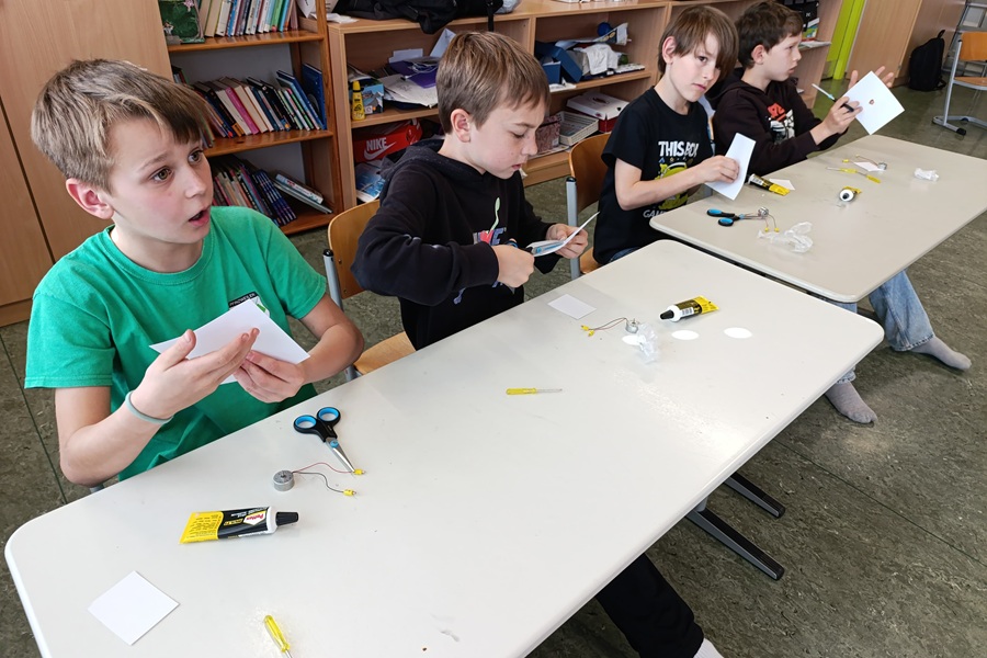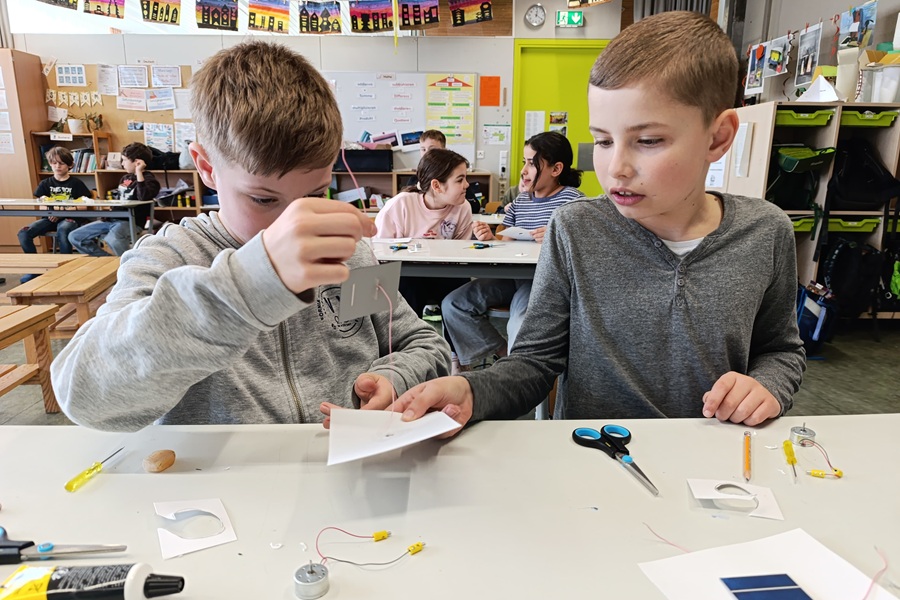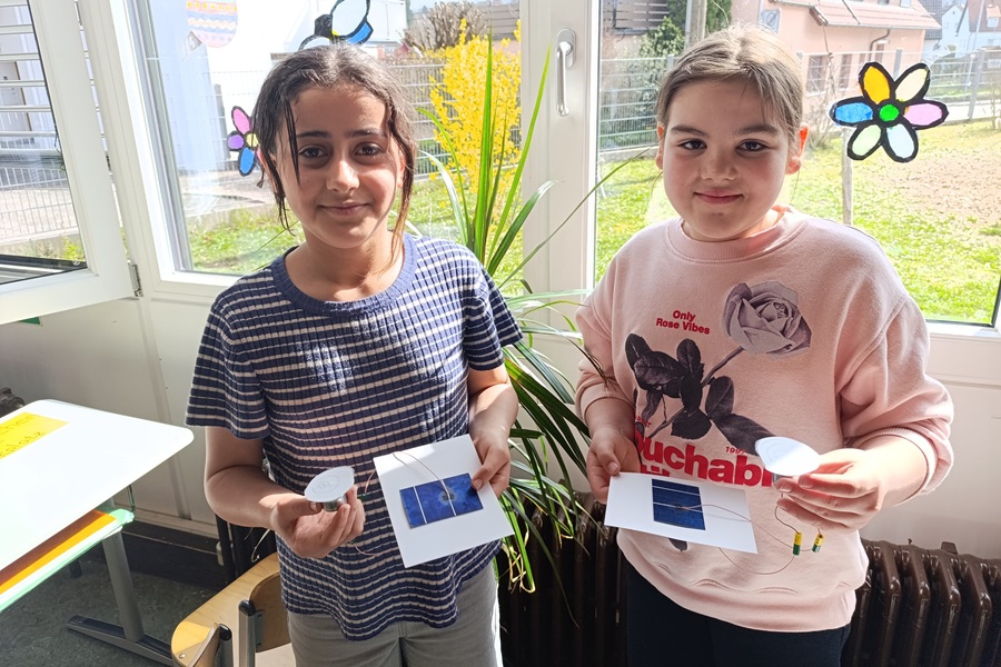 Im Anschluss bekamen wir wichtige Infos über den Treibhauseffekt, den wir in den Stationen schon kennengelernt hatten. Anschließend rechneten wir die Kosten für elektrische Geräte im Haushalt aus. Das Highlight war der Bau eines Solarkraftwerks am Ende des Schultages. Aus einem Elektromotor, einem großen und kleinen Blatt, Schraubenzieher, Schere und Flüssigkleber sowie einer Solarzelle schafften wir es, mithilfe des Sonnenlichts eine bemalte Scheibe auf einer Achse zu bewegen.